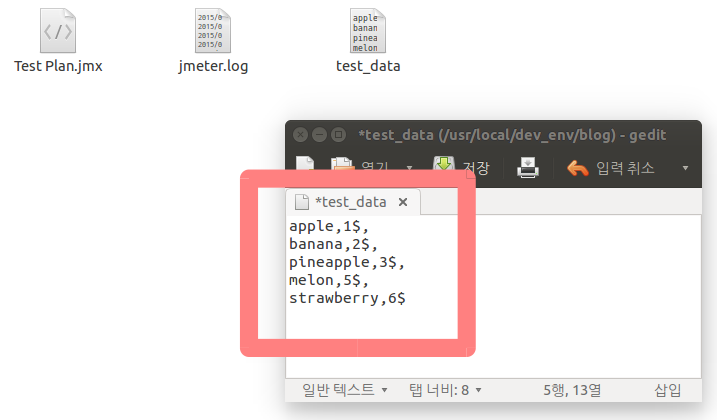 사전에 준비된 테이터를 실행할 jmx파일(jmeter test file)과 같은 경로에 놓아둡니다.