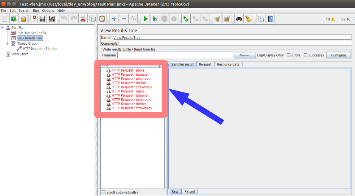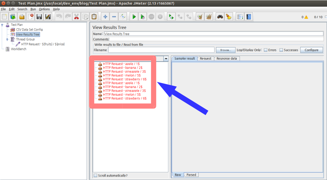 Add, and then one HTTP Request to the Thread GroupAdd the $ {fruits} in the name$ {} As an expression language that is used in jmeterJust it allows you to use the fruits were entered in the Variable Names. |