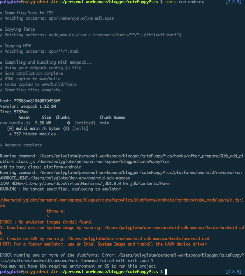 사실 한번 실행되는것만 확인하면 이후부터는 웹으로 작업을 진행하면 되기때문에문제가 안되는데 한번이!!!!!!!!!! 제대로 실행이 안되네요...스택오버플로우 검색해보았지만 ionic2관련된것은 없군요...
